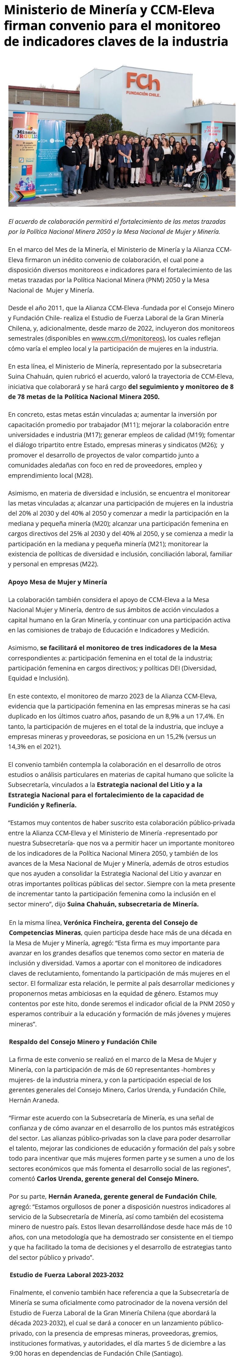 Ministerio de Minería y CCM-Eleva firman convenio para el monitoreo de indicadores claves de la industria - (portalinnova.cl)