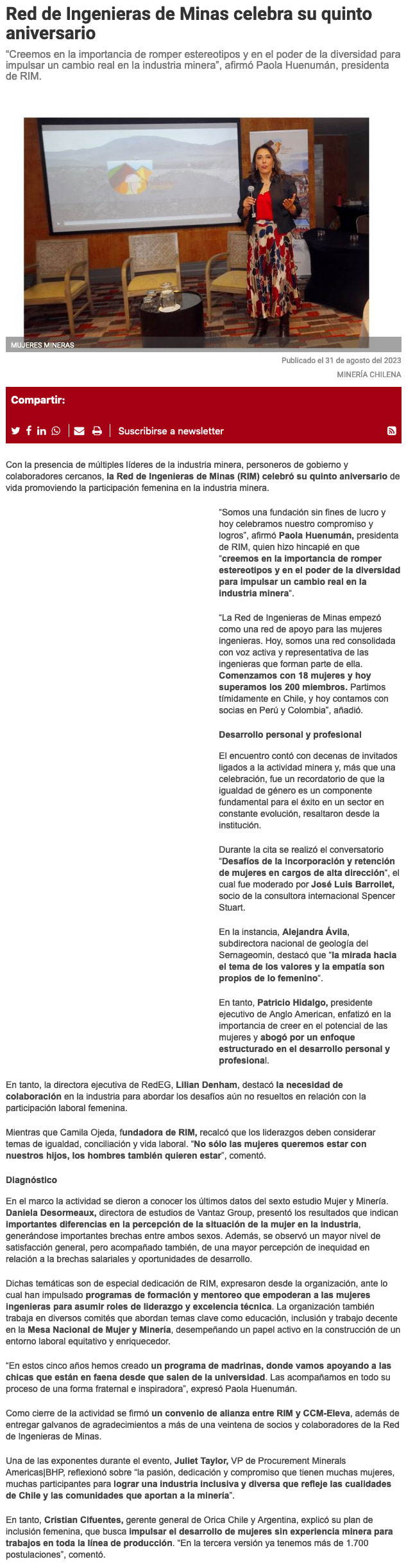 RIM celebra los cinco años de avance que han tenido fomentando la inclusión de la mujer en minería - (reporteminero)