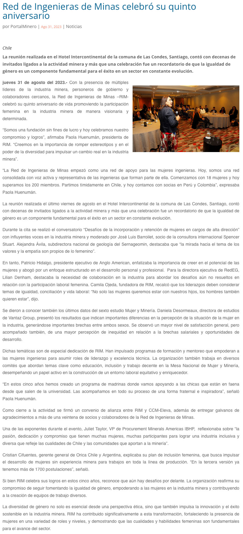 RIM celebra los cinco años de avance que han tenido fomentando la inclusión de la mujer en minería - (reporteminero)