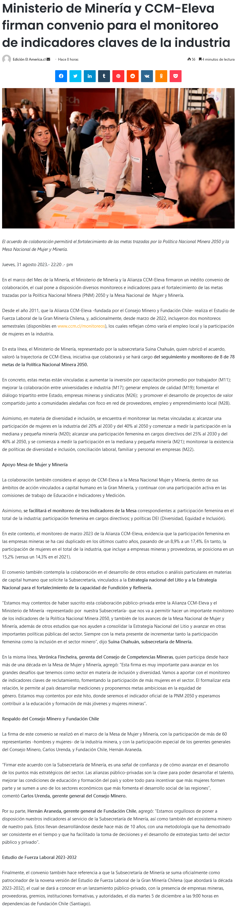 Ministerio de Minería y CCM-Eleva firman convenio para el monitoreo de indicadores claves de la industria - (portalinnova.cl)