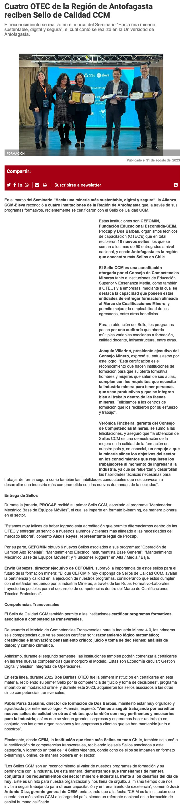 Cuatro OTEC de la región de Antofagasta reciben Sello de Calidad CCM - (nuevaminería online)