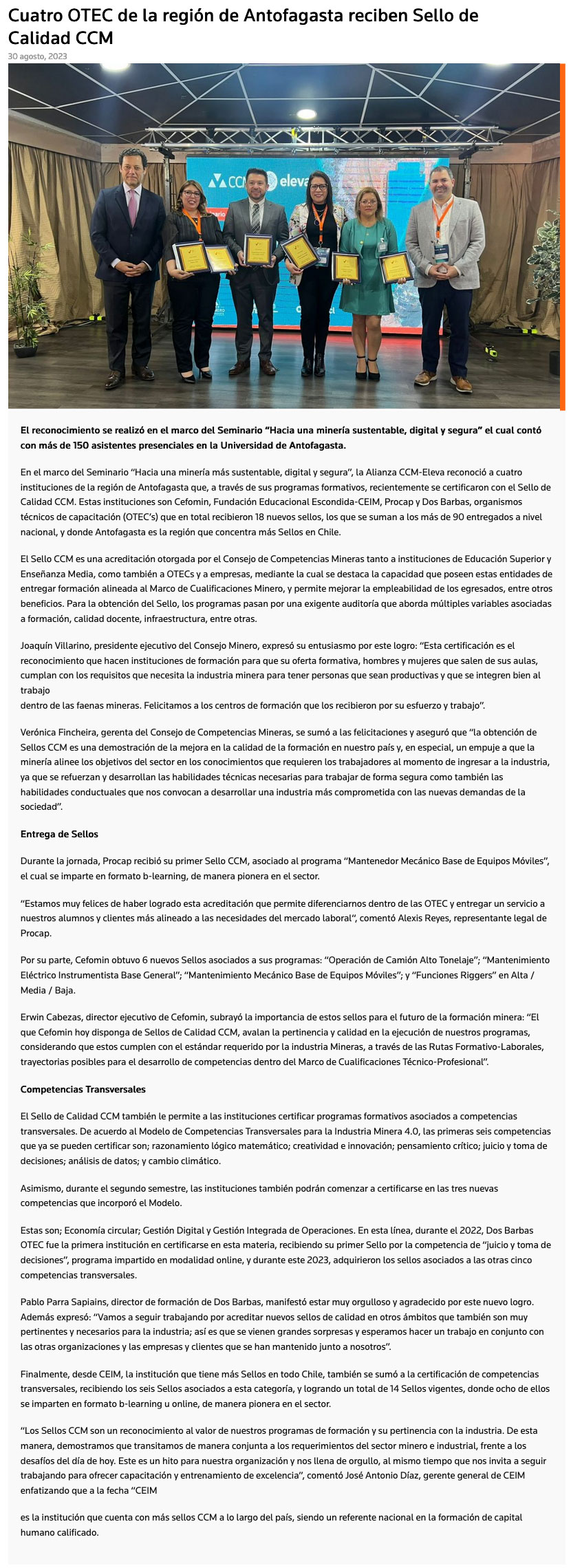Cuatro OTEC de la Región de Antofagasta reciben Sello de Calidad CCM - (mch.cl)