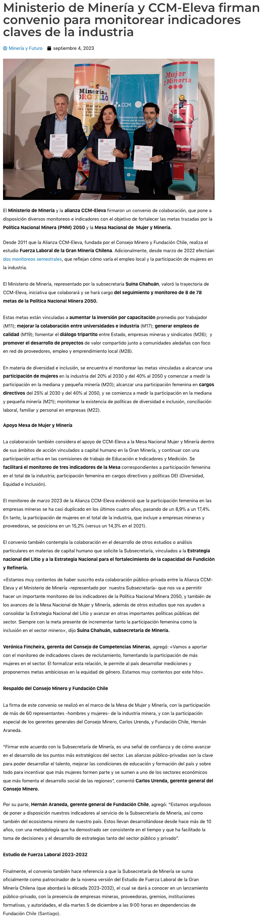 Ministerio de Minería y CCM-Eleva firman convenio para el monitoreo de indicadores claves de la industria - (norteyenergia.cl)