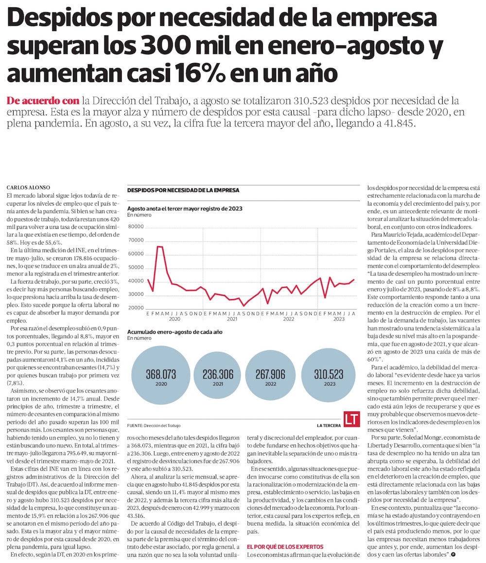 Despidos por necesidades de la empresa suman 310 mil y suben 16% - (El Mercurio de Santiago)