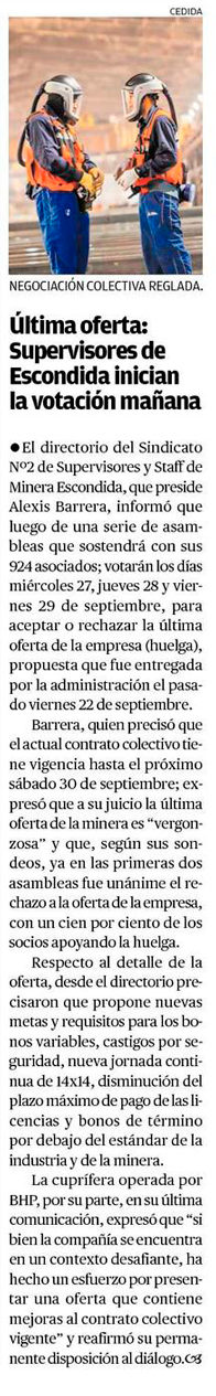 Supervisores llaman a rechazar oferta de Escondida - (El Mercurio de Santiago)