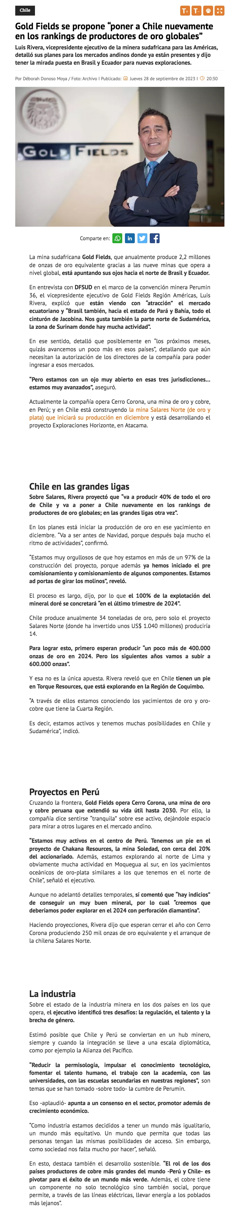 Gold Fields se propone “poner a Chile nuevamente en los rankings de productores de oro globales” - (Diario Financiero)