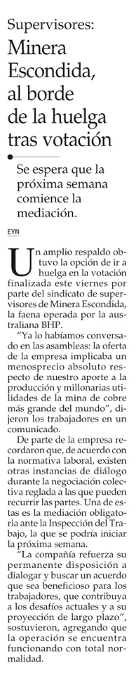 Supervisores de Escondida rechazan última oferta y huelga podría comenzar el miércoles - (El Mercurio de Antofagasta)