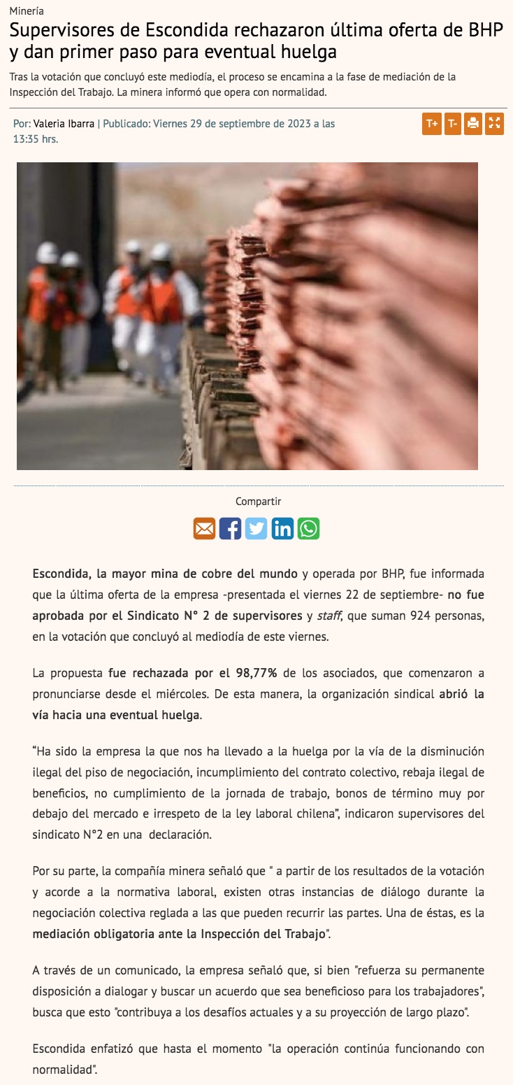 Supervisores de mina Escondida abrirían vía a huelga con rechazo de oferta - (Pulso Online)