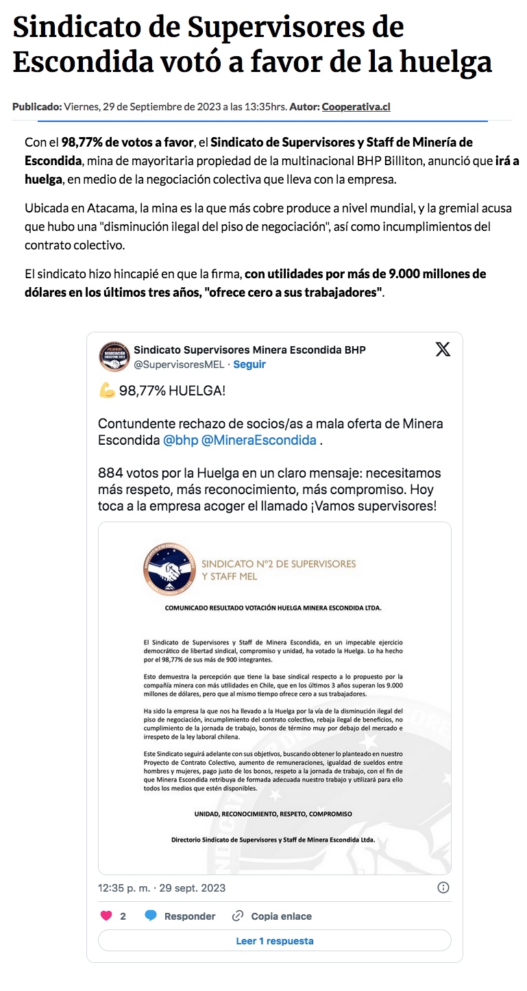 Sindicato de minera de Escondida votó por ir huelga: Acusan "menosprecio" y que bonos son bajos - (biobiochile online)