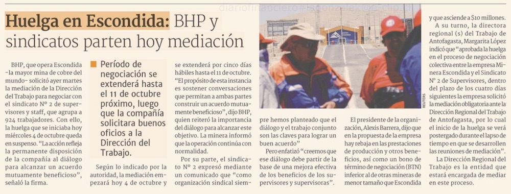 Minera Escondida busca mediación de la Dirección del Trabajo ante huelga - (El Mercurio de Calama)