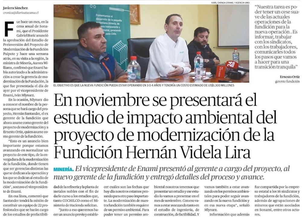 Enami iniciará en noviembre tramitación de proyecto de fundición en Paipote - (El Mercurio de Santiago)