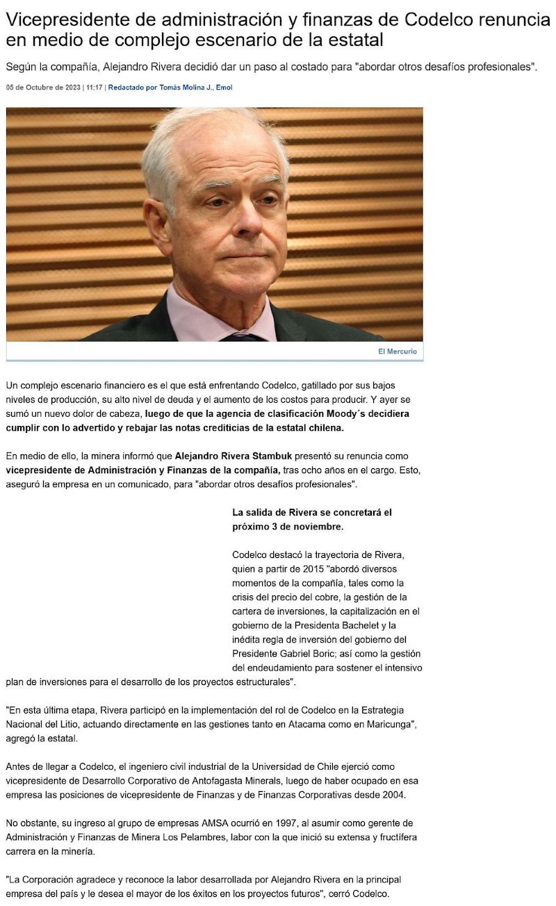 Tras rebaja en la clasificación, la minera estatal anuncia salida del VP de Finanzas - (El Mercurio de Santiago)