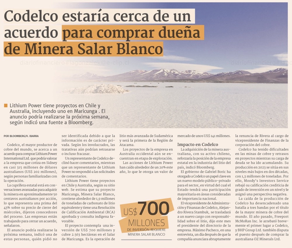 Codelco estaría cerca de un acuerdo para comprar la australiana Lithium Power - (DF Online)