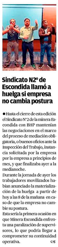 Sindicato de supervisores de Escondida no llega a acuerdo con BHP y votará si inician huelga este jueves - (Pulso)