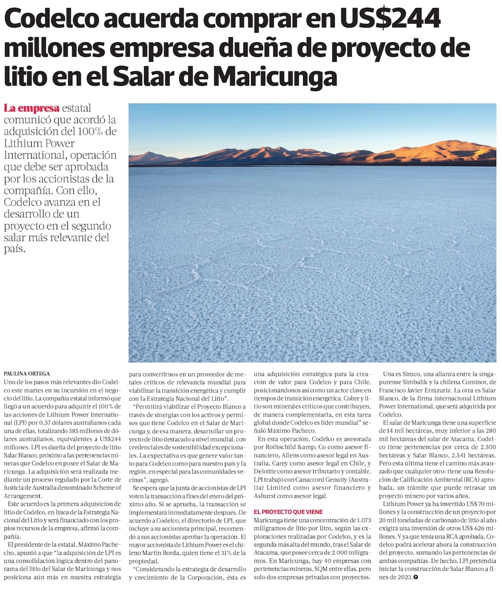 Codelco acuerda adquirir australiana Lithium Power en US$ 244 millones - (Diario Financiero)