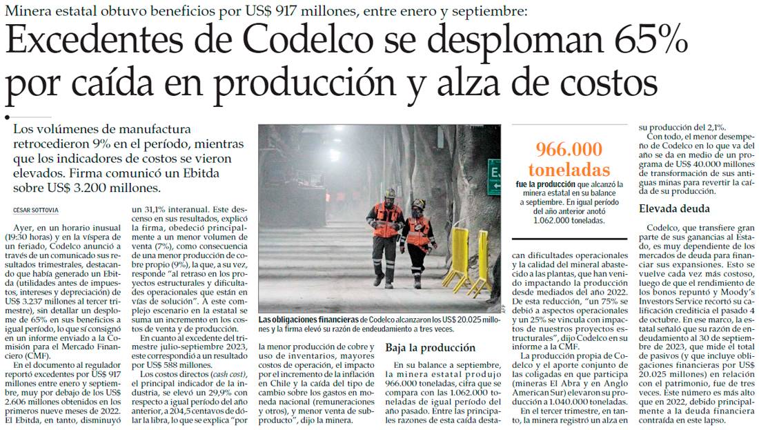 Excedentes de Codelco caen 65% al tercer trimestre y alcanzan los US$ 917 millones - (Pulso)