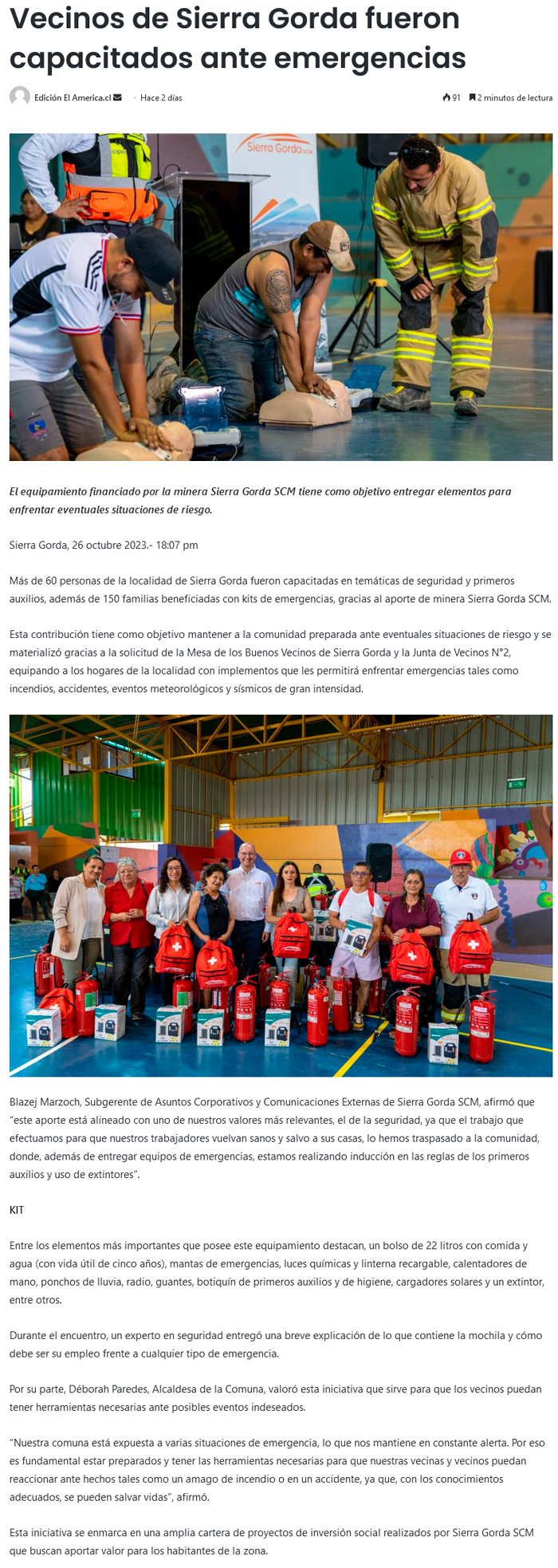 Vecinos de Sierra Gorda se capacitan ante emergencias y reciben kits de seguridad - (El Mercurio de Calama)