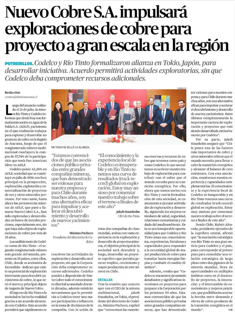 Minera estatal y Rio Tinto sellan, en Tokio, acuerdo para impulsar iniciativa en conjunto en Región de Atacama - (El Mercurio de Santiago)