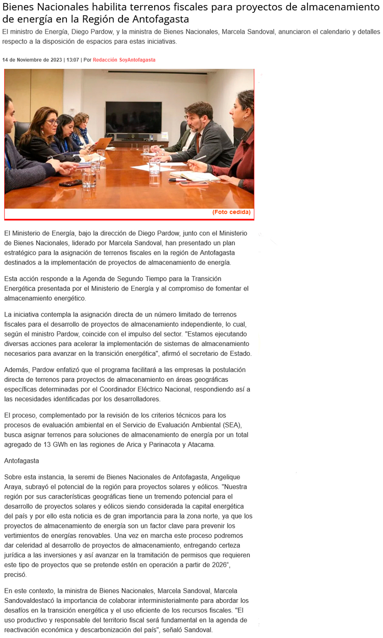 Plan asignará terrenos fiscales para almacenamiento de energía limpia - (El Mercurio de Antofagasta)