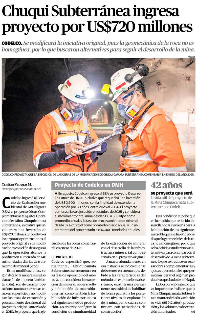 Codelco ingresa proyecto y la inversión en Chuquicamata subirá a casi US$ 6.000 mills. - (El Mercurio de Santiago)