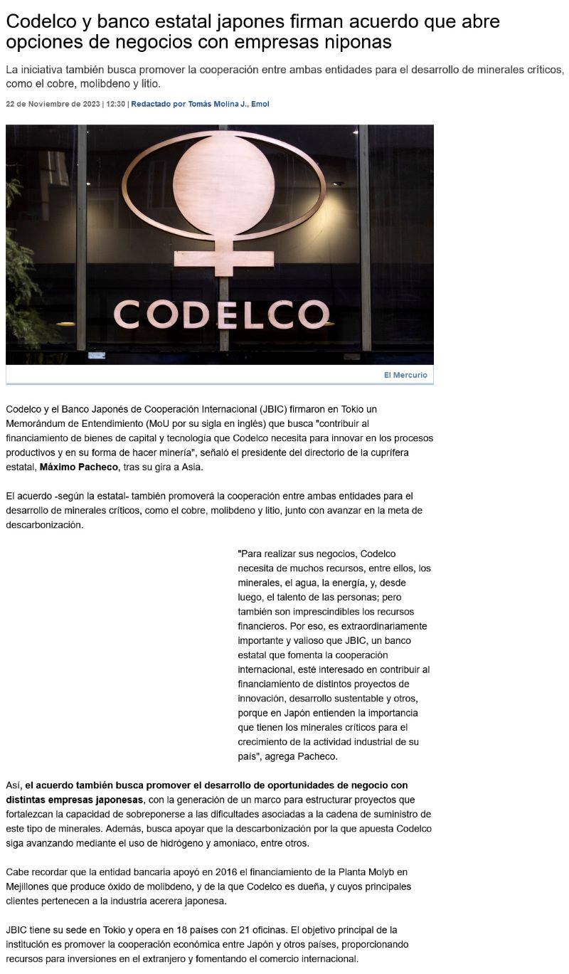 Codelco firma acuerdo con banco estatal japonés - (mch.cl)