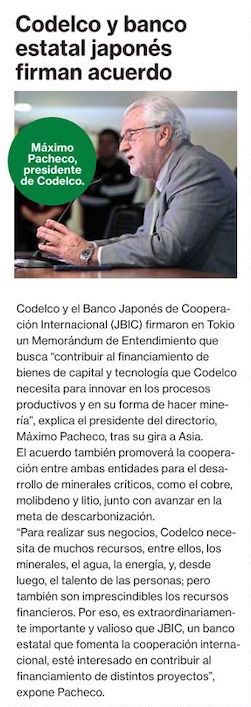 Codelco firma acuerdo con banco estatal japonés - (mch.cl)