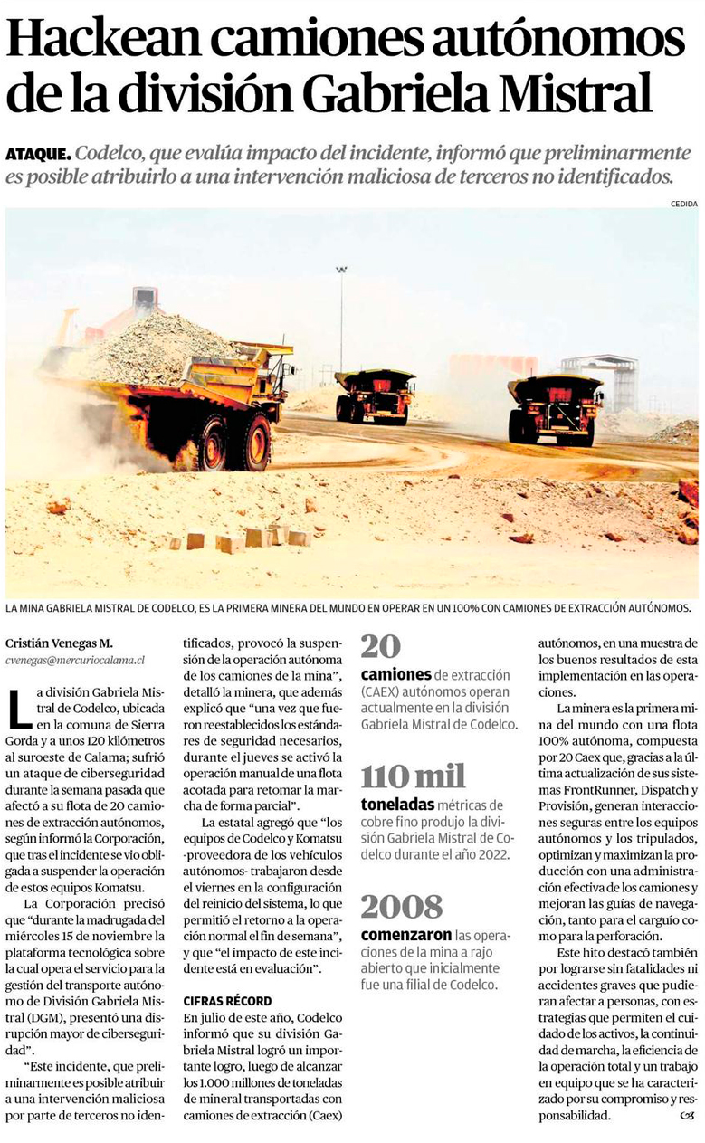 Más problemas en la minera estatal: el ciberataque que golpeó la producción de su faena Gaby - (Pulso)