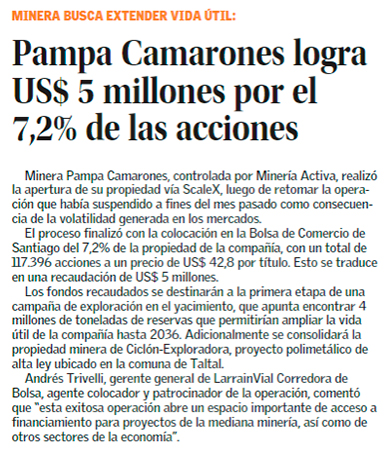 Pampa Camarones concreta su apertura en la Bolsa y recauda US$5 millones - (Pulso)