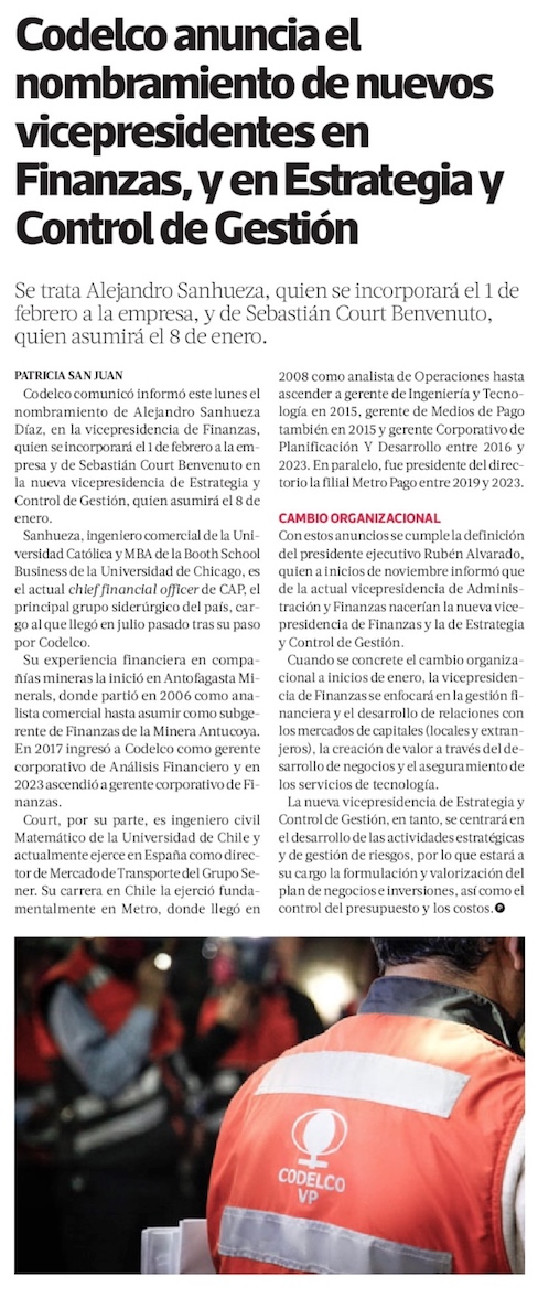 Codelco designa a nuevos vicepresidentes, con el objetivo de recuperar niveles de producción - (El Mercurio de Santiago)