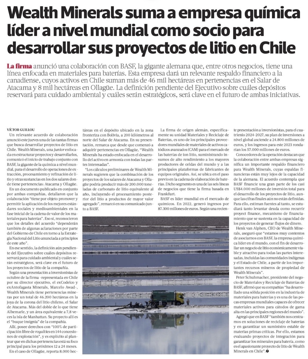 Wealth Minerals acuerda impulsar proyectos - (El Mercurio de Santiago)