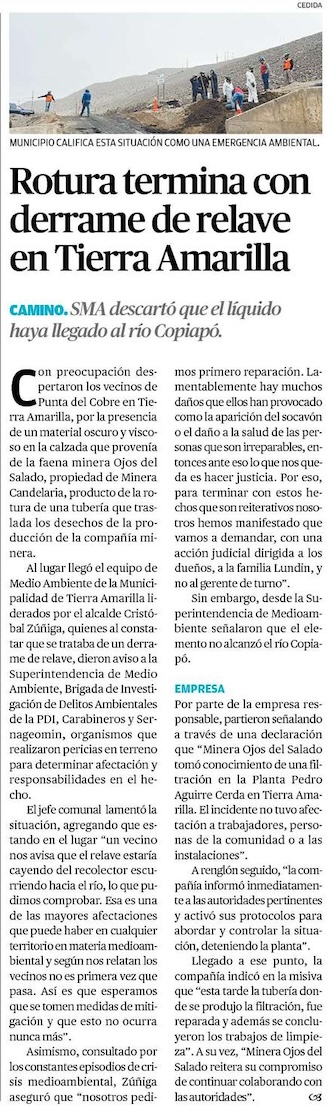 Emergencia ambiental por derrame de relave en Tierra Amarilla - (radiocandelariafm.cl)