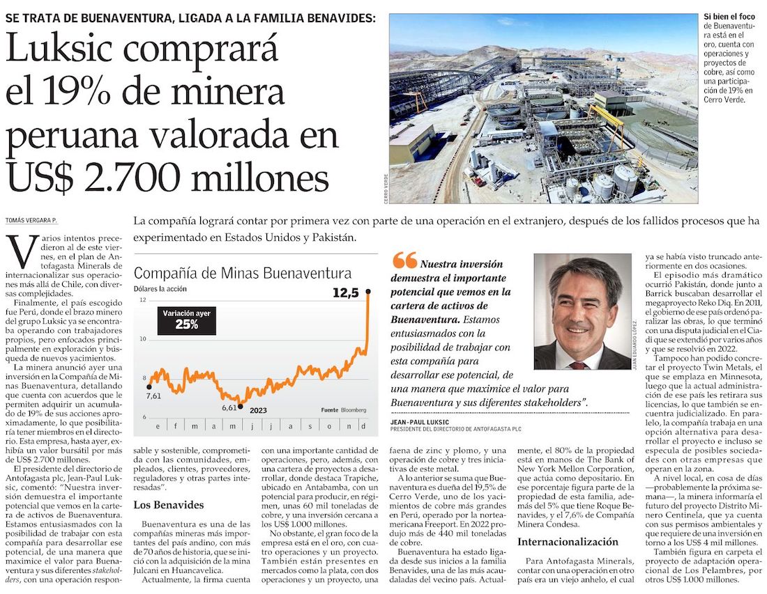 Minera de los Luksic compra el 19% de grupo peruano cuyo valor en bolsa supera los US$2.800 millones - (Pulso)