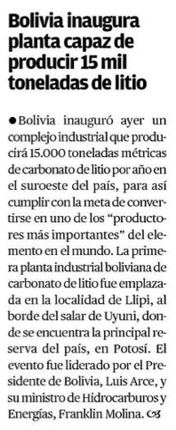 Bolivia inaugura planta con la que apuesta a ser uno de los mayores productores mundiales de litio - (biobiochile online)