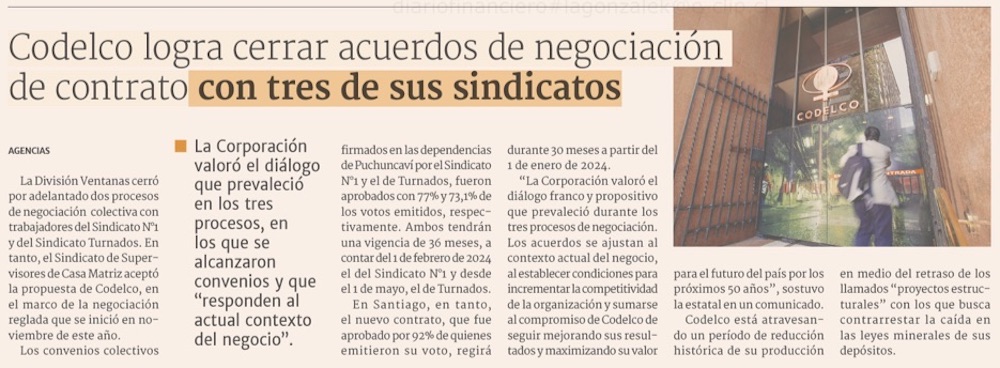 Codelco cierra acuerdos colectivos en Ventanas y supervisores - (Pulso)