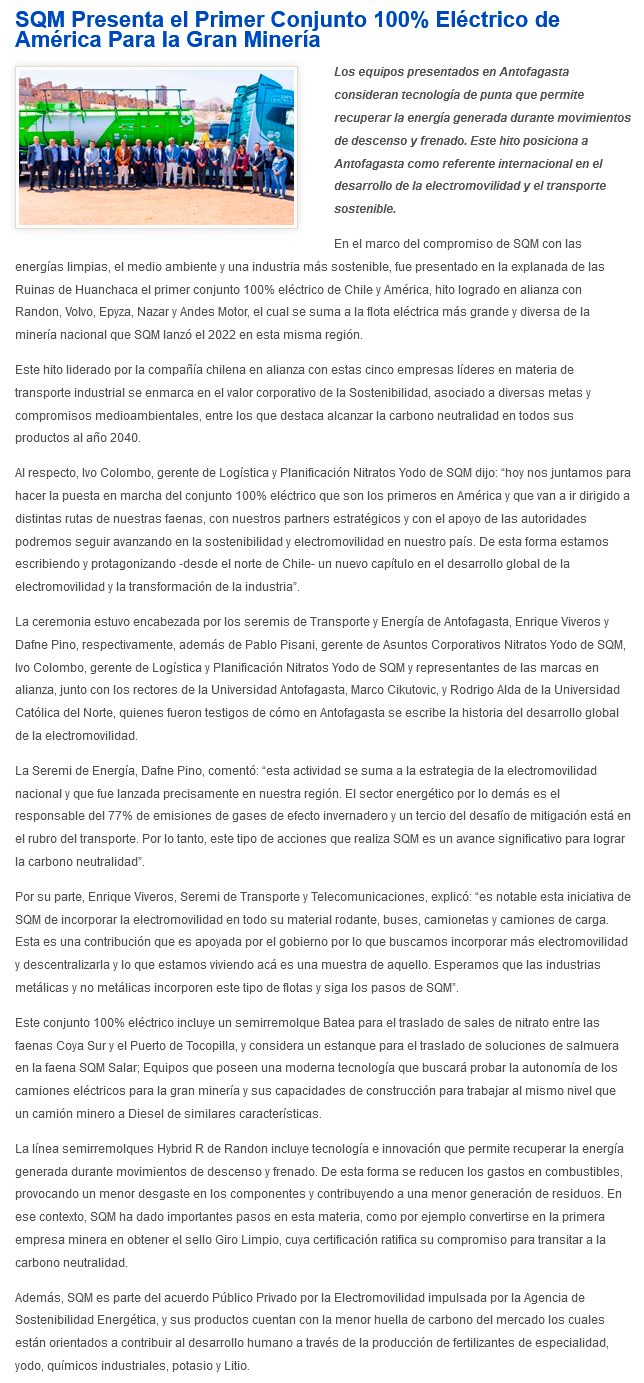 SQM presenta el primer conjunto 100% eléctrico - (El Mercurio de Antofagasta)