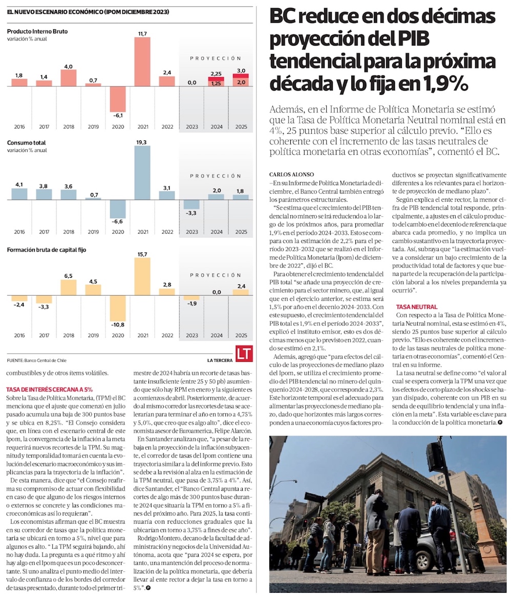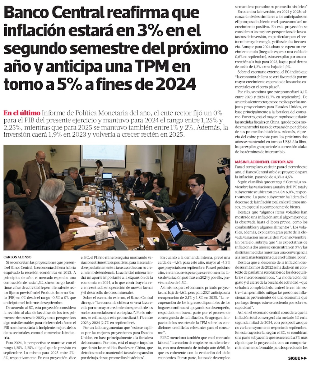 Banco Central asume que el PIB eludirá una caída este año y ratifica retorno al 3% de inflación en segunda mitad de 2024 - (Diario Financiero)