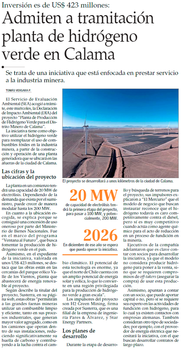La mayor planta de hidrógeno verde de Chile ingresa al SEA de la mano de Gonzalo Blumel - (La Segunda)