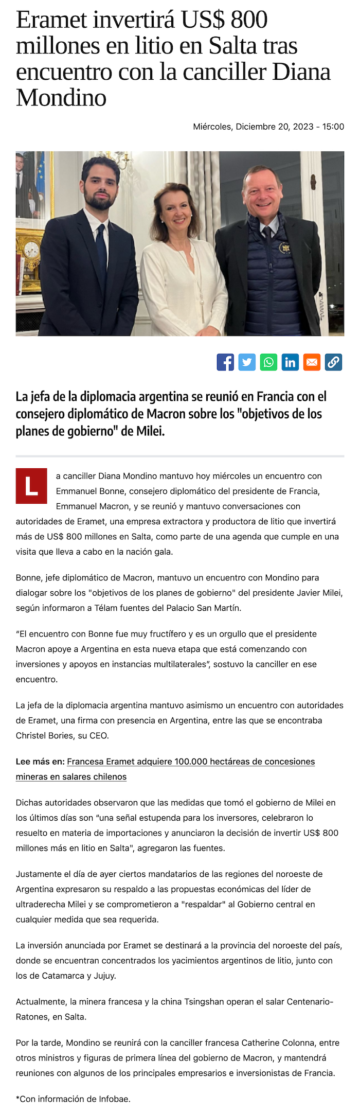 Empresa francesa hará millonaria inversión para el desarrollo del litio en Argentina - (biobiochile online)