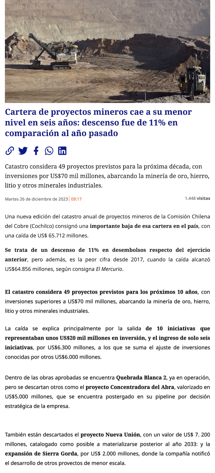 Inversiones mineras alcanzarán US$17.493 millones al año en 2032 - (El Mercurio de Antofagasta)