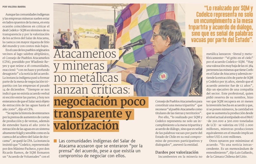 Consejo acusa que el acuerdo entre Codelco y SQM se hizo de espaldas a las comunidades - (El Mercurio de Antofagasta)