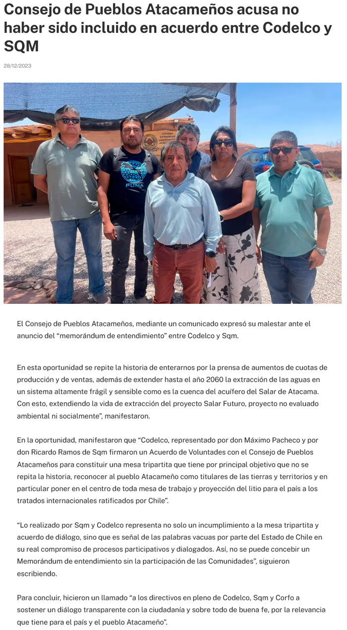 Consejo acusa que el acuerdo entre Codelco y SQM se hizo de espaldas a las comunidades - (El Mercurio de Antofagasta)