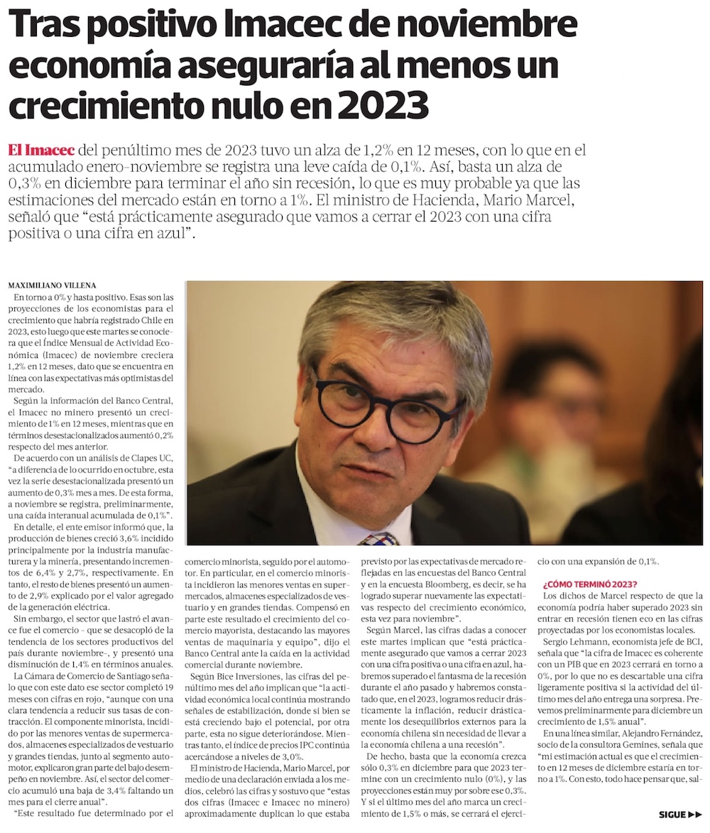 Tras repunte en noviembre, economía se acerca a nulo crecimiento en 2023 y mercado prevé baja de tasas de 75 puntos en enero - (Diario Financiero)