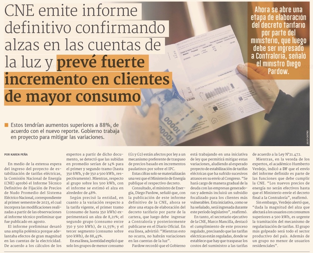 Cuentas de la luz: CNE publica documento clave que anticipa alzas desde 8% hasta 88% - (El Mercurio de Santiago)