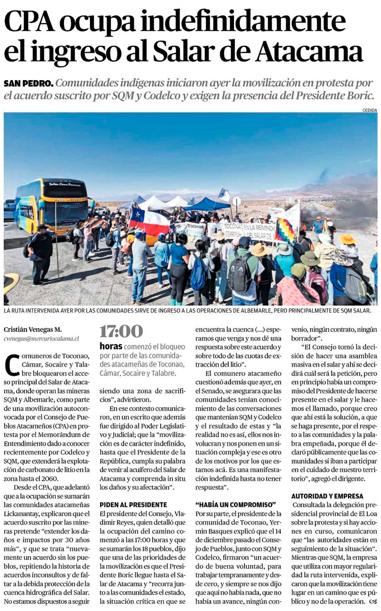 Pueblos atacameños inician 'toma' indefinida en el Salar de Atacama por acuerdo Codelco-SQM por el litio - (soyantofagasta)
