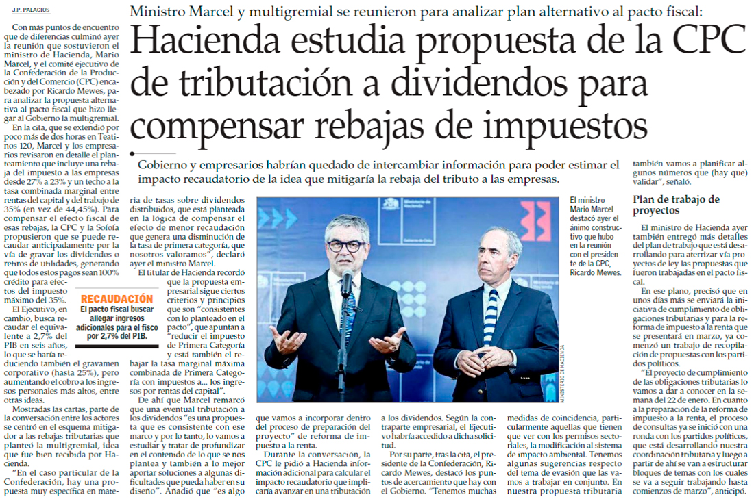 Gobierno evalúa considerar propuestas de la CPC y Sofofa en el pacto fiscal - (Diario Financiero)