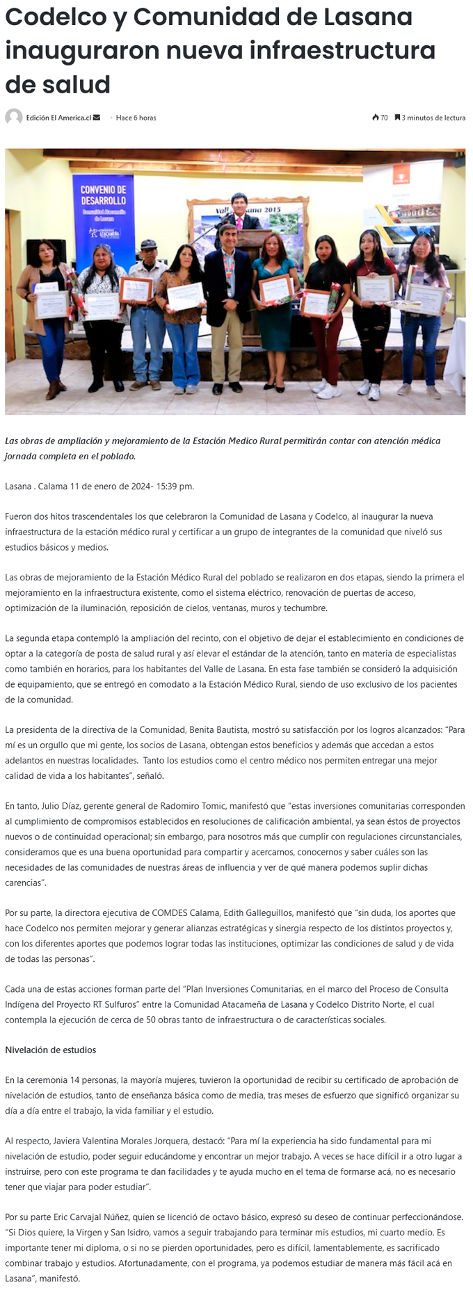 Codelco y Lasana inauguran nueva infraestructura de salud del poblado - (El Mercurio de Antofagasta)