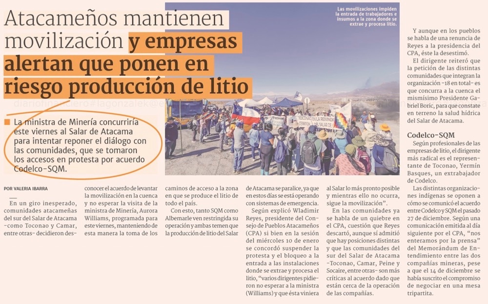 Bloqueos al salar de Atacama presionan operación de SQM - (El Mercurio de Santiago)