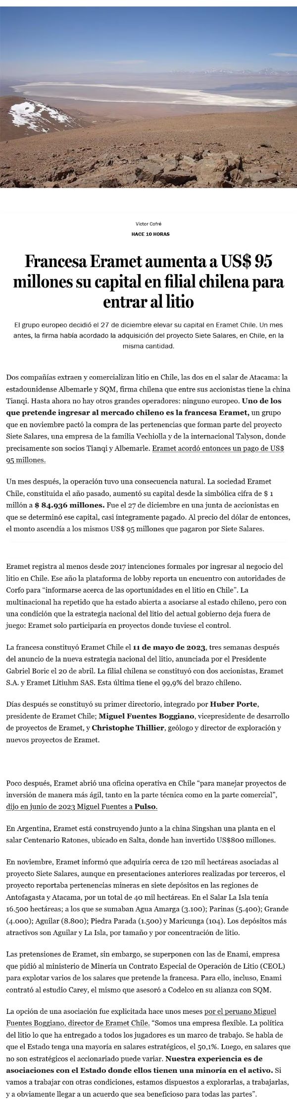Francesa Eramet aumenta a US$95 millones su capital en filial chilena para entrar al litio - (Pulso)