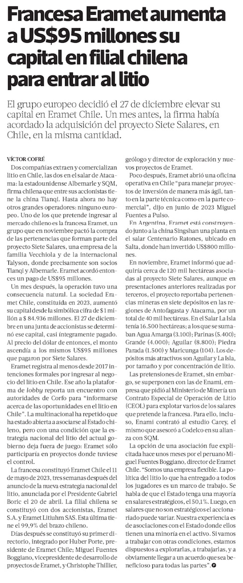 Francesa Eramet aumenta a US$ 95 millones su capital en filial chilena para entrar al litio - (La Tercera Online)