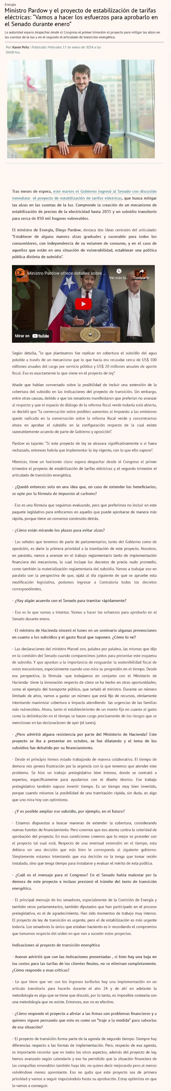Estabilización de tarifas: Pardow asegura que propuesta “minimiza impacto en el bolsillo de los consumidores” - (Diario Financiero)